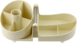 Organizator je izdelan iz trpežne plastike, ki je varna, netoksična in okolju prijazna. Ima vrtljivi del, ki se lahko zavrti za 360°, kar zagotavlja enostaven dostop do vsebine brez premikanja celotnega vsebnika. Različno visoki predelki omogočajo shranjevanje tako visokih stekleničk kot tudi manjših predmetov.