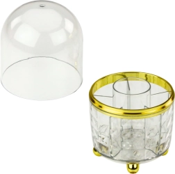 Eleganten organizator s prozornim pokrovom je stilska rešitev za vsako toaletno mizico, pisalno mizo ali polico v kopalnici. Odlikuje ga 360° vrtljivost, ki omogoča hitro obračanje posode za lažje iskanje pravega predalčka. Prozoren pokrov ščiti kozmetiko in čopiče pred prahom in umazanijo.