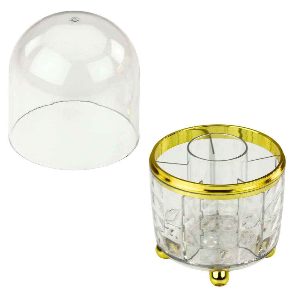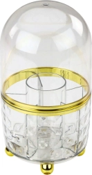 Organizator je izdelan iz trpežne plastike v videzu stekla in okrašen z elegantnimi zlatimi detajli. V notranjosti so praktični predelki za organizacijo čopičev, šmink, maskar ali drobnih dodatkov.
