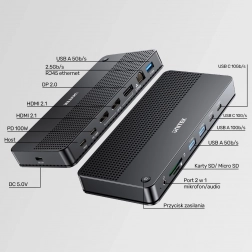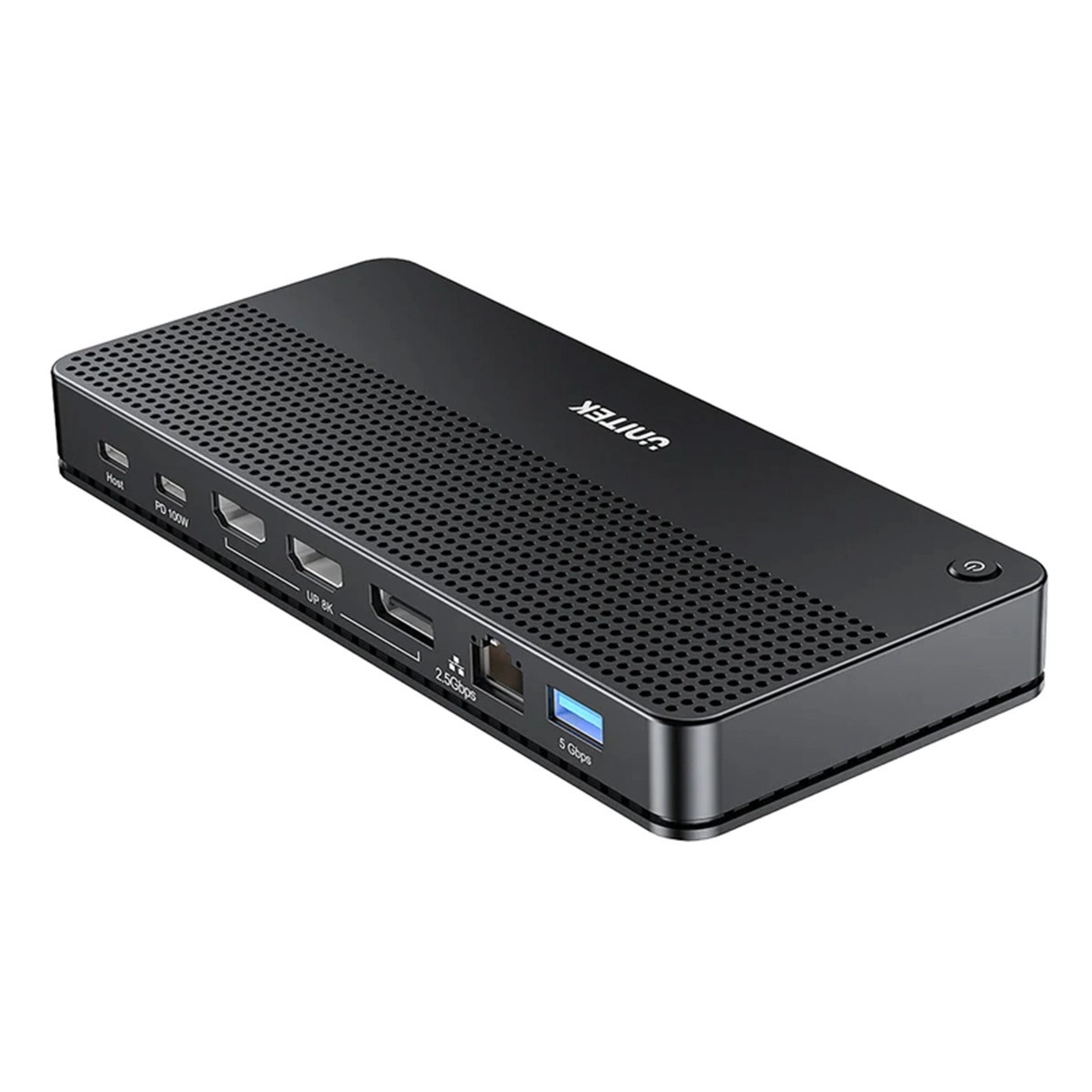 Uživajte v preprostosti in zmogljivosti, ki ju nudi priklopna postaja Unitek, ki omogoča hkratno povezavo vseh potrebnih perifernih naprav. Reži za SD in Micro SD kartico, trije video vhodi (2x HDMI in 1x DisplayPort), trojica USB-A in dvojica USB-C vrat, Ethernet RJ-45 s hitrostjo prenosa do 2,5 Gbps – vse to v eni elegantni napravi.
