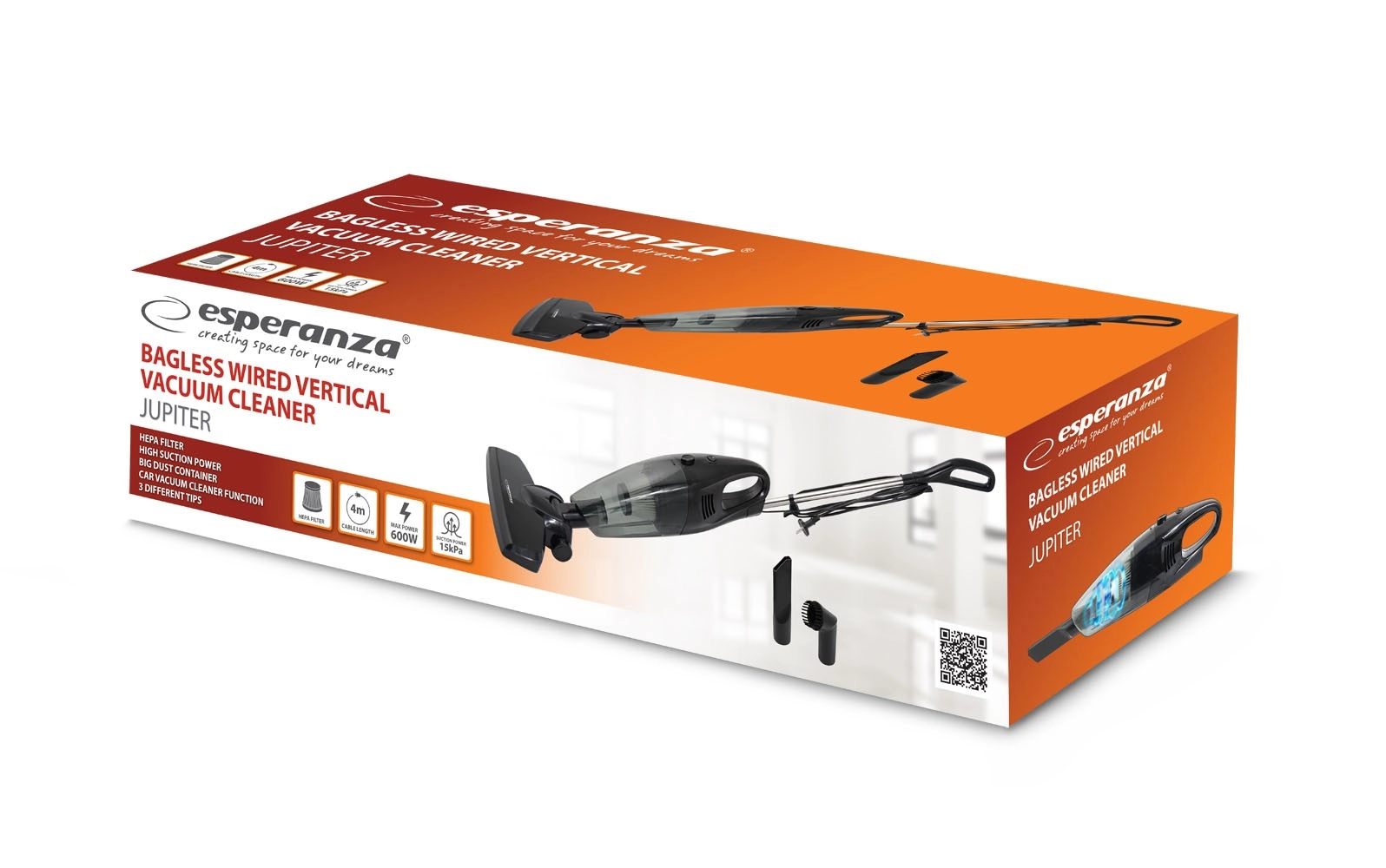 Esperanza Jupiter je sodoben pokončni žični sesalnik, zasnovan za hitro in učinkovito čiščenje vseh vrst tal. Zahvaljujoč lahki zasnovi, udobnemu ročaju in zamenljivemu HEPA filtru je idealen za vsakodnevno uporabo.