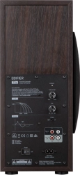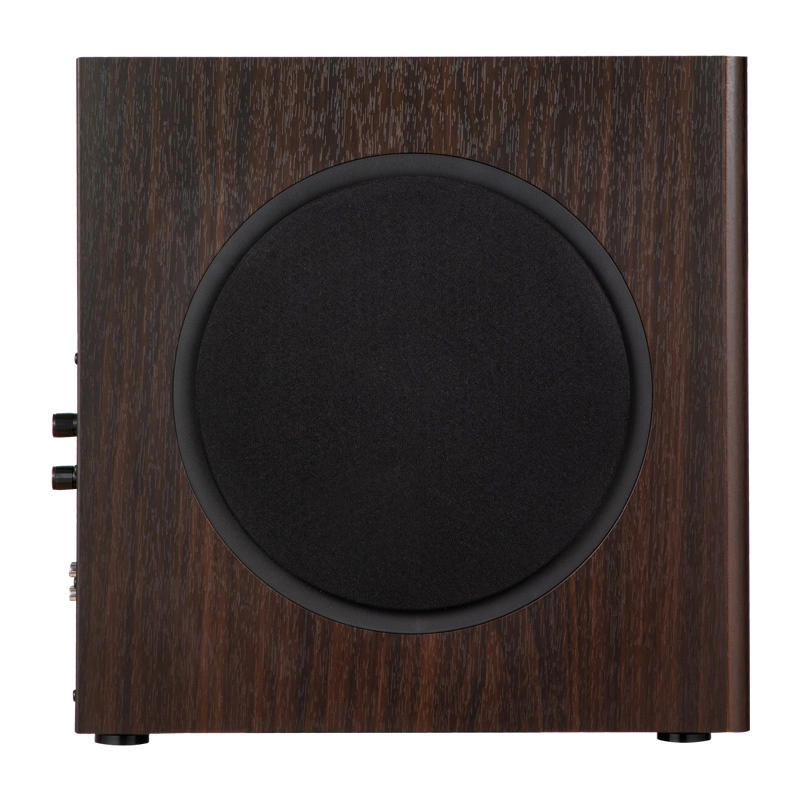 Vzdržljiva konstrukcija iz 18 mm MDF zmanjšuje resonance, medtem ko rjav leseni premaz zagotavlja estetski videz. Vhodi in izhodi RCA zagotavljajo široko združljivost z drugimi napravami.