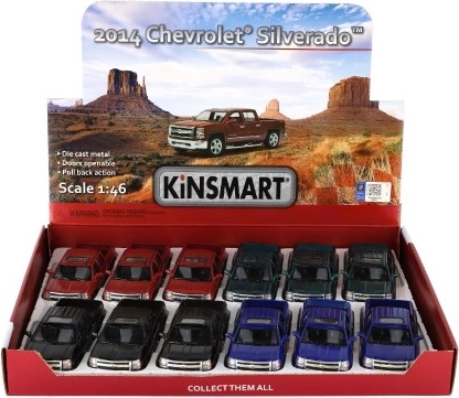 Kovinski model Kinsmart Chevrolet Silverado 2014 v merilu 1:46 ponuja realistično izdelavo, odpirajoča se vrata in povratni pogon za zabavno vožnjo. Dolžina 13 cm, na voljo v 4 barvah, odličen za otroke od 3 let naprej in za zbiratelje.