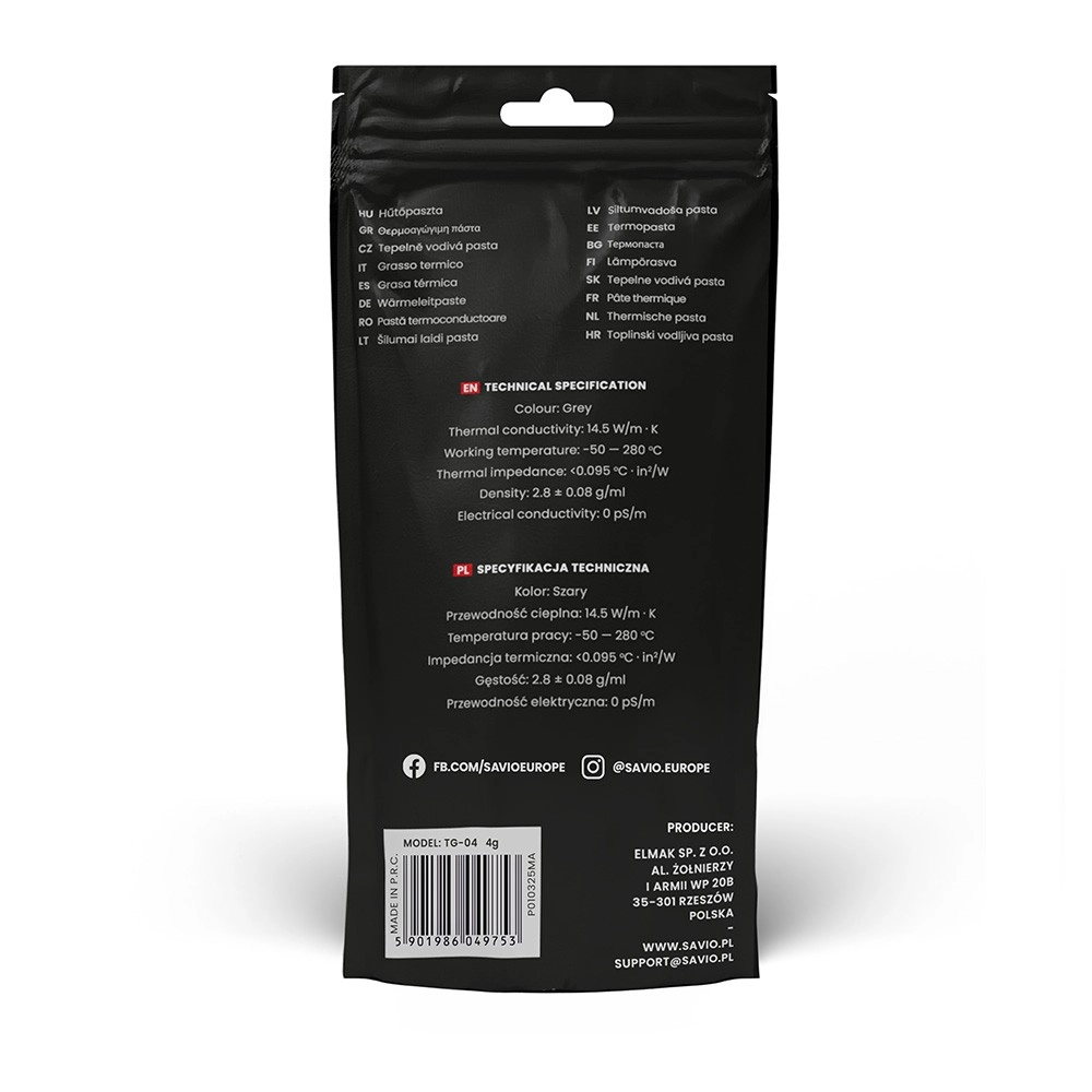Termovodna pasta Savio Glacier TG-04 je idealna izbira za zagotavljanje optimalnega odvajanja toplote med procesorjem in hladilnikom. Ta pasta z odlično toplotno prevodnostjo 14,5 W/mK zapolnjuje mikroskopske prostorske nepravilnosti, kar povečuje učinkovitost hlajenja.