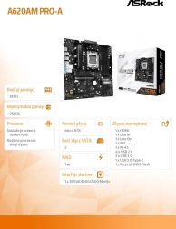 Matična plošča A620AM PRO-A AM5 je opremljena z modernimi funkcijami in ponuja podporo za procesorje AMD Ryzen serij 9000, 8000 in 7000 z vtičnico AM5. Zahvaljujoč 6+2+1 faznemu napajalnemu sistemu Dr.MOS zagotavlja stabilno in učinkovito zmogljivost. Podpira do 4 pomnilniške module DDR5 DIMM z možnostjo Dvojnega kanala in taktiranjem do 8000+ MHz (OC).