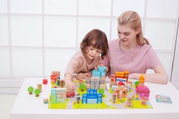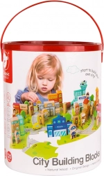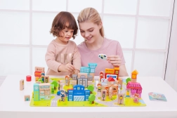Zahvaljujoč temu kompletu lahko otroci zgradijo tipične mestne zgradbe kot so šola, policijska postaja, gasilska postaja, letališče, bolnišnica, banka, restavracija, trgovina za hišne ljubljenčke in druge. Igrača je izdelana iz naravnih, biološko razgradljivih in hipoalergenih materialov, kar zagotavlja največjo varnost.
