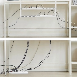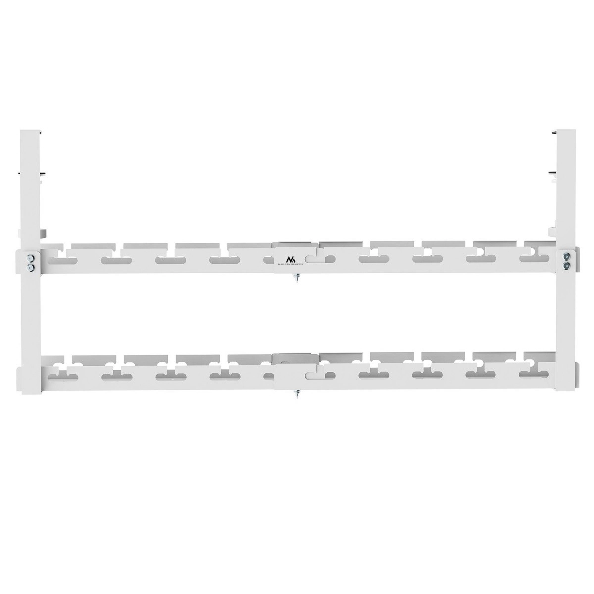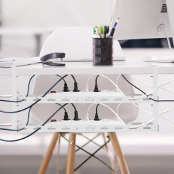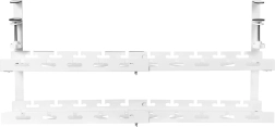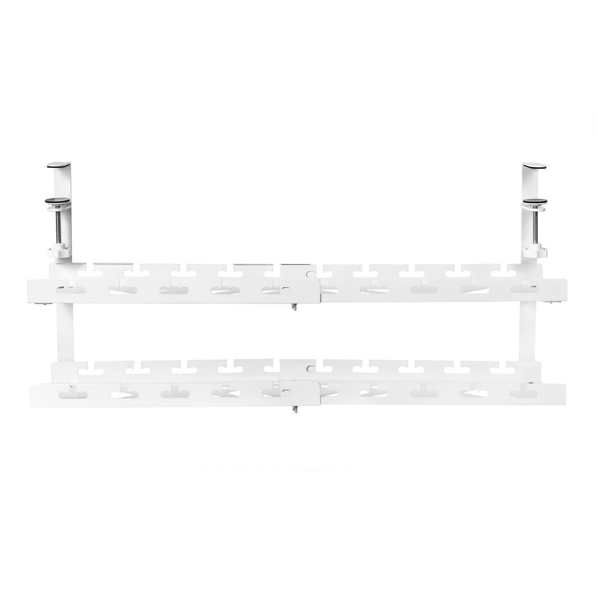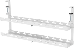 Podmizni organizator ima dve ravni nosilcev, ki omogočata hkratno namestitev dveh napajalnih letvic ali dodatnih naprav, kot so adapterji, USB‑zbiralniki ali usmerjevalniki. Sistem vpenjalnega (kleščnega) pritrjevanja omogoča hitro in neinvazivno montažo brez vrtanja ali poškodovanja površine pohištva.