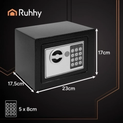 Sef RUHHY ponuja zanesljivo shranjevanje dokumentov, gotovine ali nakita v robustni jekleni konstrukciji. Moderna elektronska zaščita zagotavlja, da imate dostop pod nadzorom, z nujnim ključem pa lahko sef odprete tudi v primeru izpraznjenih baterij. Kompaktne dimenzije omogočajo enostavno namestitev v omaro, predal ali na steno.