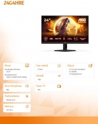 AOC 24G4HRE je 23,8" gaming monitor, ki združuje 200 Hz osveževanja, Fast IPS tehnologijo in 1 ms GtG / 0,5 ms MPRT za popolnoma tekočo sliko v hitrih prizorih. HDR10 zagotavlja živahne barve in globlji kontrast, medtem ko Adaptive Sync in združljivost z G‑SYNC odpravljata trganje in zatikanje.