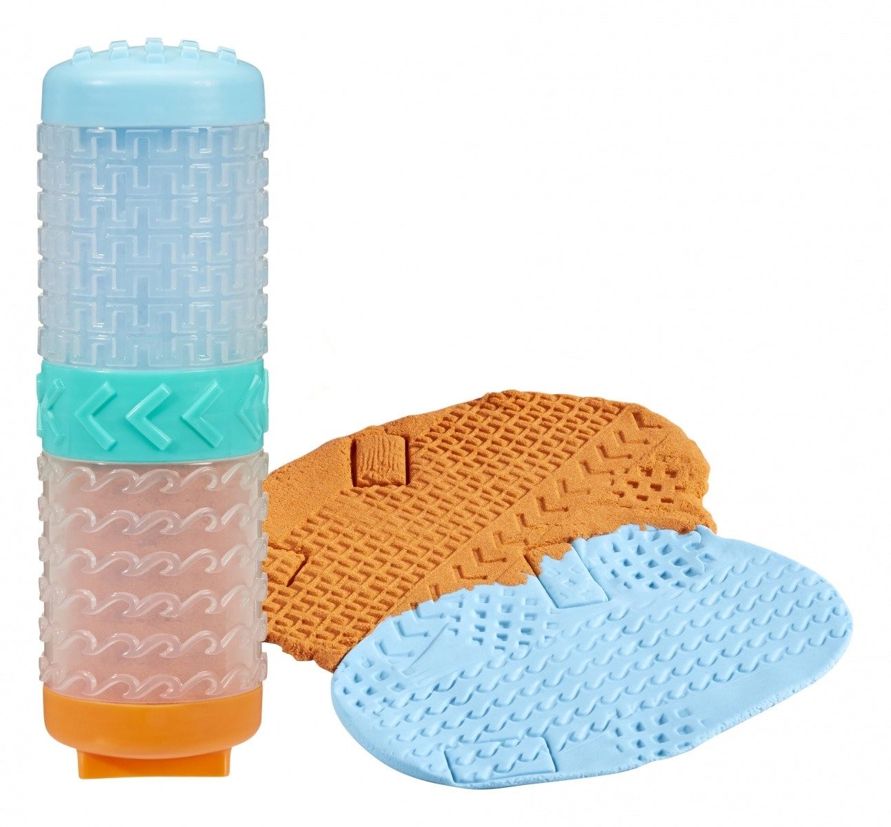 Komplet WONDER FACTORY Never Dry prinaša zabavo z modrim testom in oranžnim peskom, ki nikoli ne izsušita. Otroci lahko mešajo obe masi in ustvarijo novo strukturo z edinstvenimi učinki. Praktična, trajnostna embalaža hkrati služi kot del igre – pokrovčki in spojke imajo reliefne vzorce za motive in žige.