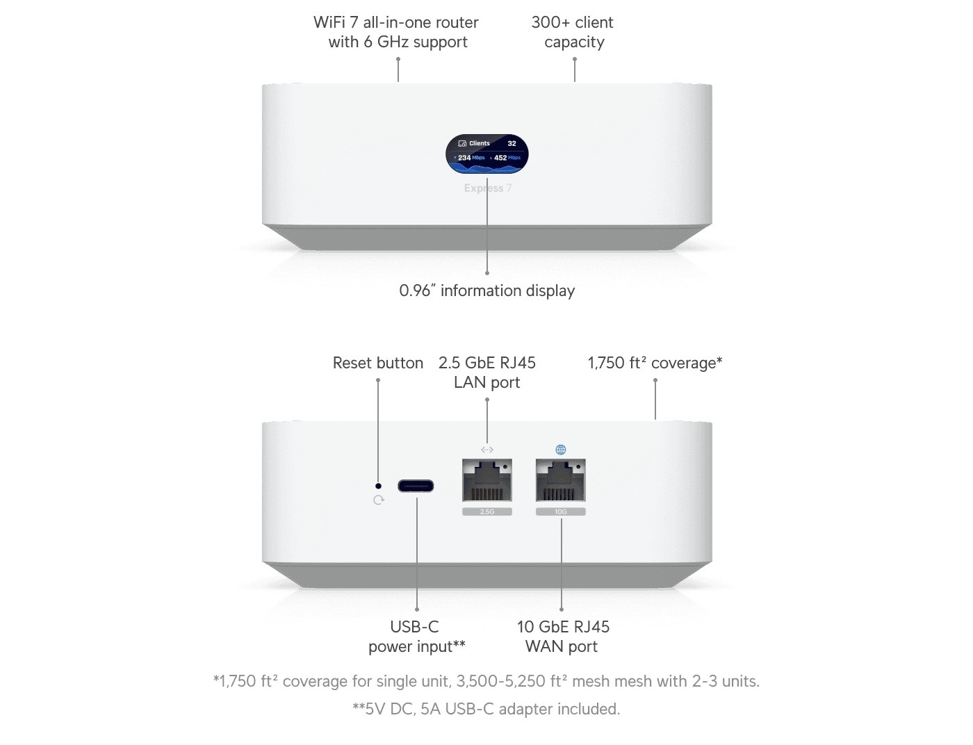 Na zadnji strani najdete visoko hitra vrata, vključno z 2.5G in 10G Ethernet za gigabitne do večgigabitne povezave, prav tako USB‑C za napajanje ali servis. Sprednji zaslon v realnem času prikazuje ključne omrežne metrike (klienti, prepustnost), kar poenostavlja nadzor in upravljanje.