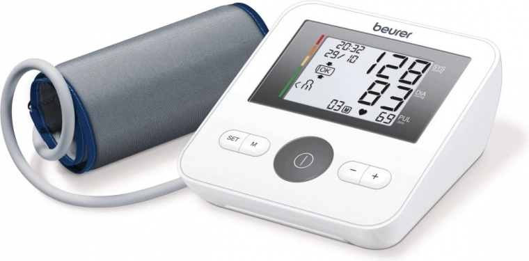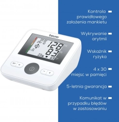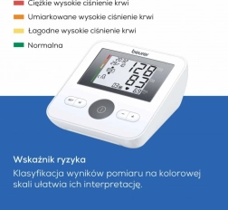 BEURER BM 27 je praktičen nadlačni merilnik za natančno in udobno merjenje v domačem okolju. Zahvaljujoč velikemu, lahko berljivemu zaslonu in barvni klasifikaciji rezultatov boste hitro ocenili svoje vrednosti krvnega tlaka. Vgrajena kontrola pravilnega nameščanja manšete pomaga zagotoviti zanesljive rezultate pri vsakem merjenju.
