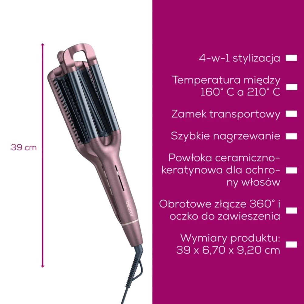 Spremenite svoj vsakdanji styling v preprosto in hitro rutino. Kodralnik BEURER HT65 4v1 ponuja štiri priljubljene stile v eni napravi – od sproščenih Beach Waves do gladkih vodnih valov. Keramično-keratinska površina enakomerno porazdeljuje toploto in hkrati pomaga zaščititi lase, da ostanejo gladki, sijoči in prožni.