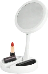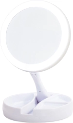 Elegantno namizno ogledalo z LED osvetlitvijo in dvostransko površino (1× in 10× povečava) je idealno za ličenje, nego kože in vstavljanje leč. Zahvaljujoč 180° vrtljivemu mehanizmu zlahka preklapljate stran, medtem ko priročen organizator v osnovi ohranja kozmetiko pri roki. Napajanje omogočajo 4× AA baterije ali kabel MicroUSB za maksimalno udobje.