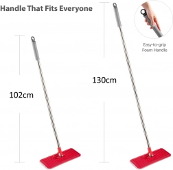 Lahkoten in nastavljiv ročaj olajša čiščenje velikih površin in visokih oken. Ultraploščat nastavek z vrtljivo glavo zagotavlja natančno čiščenje pod sedežno garnituro, omaricami in okoli nog pohištva. Komplet vsebuje 2 nadomestni mikrovlakneni prevleki za dolgo življenjsko dobo in higiensko uporabo.