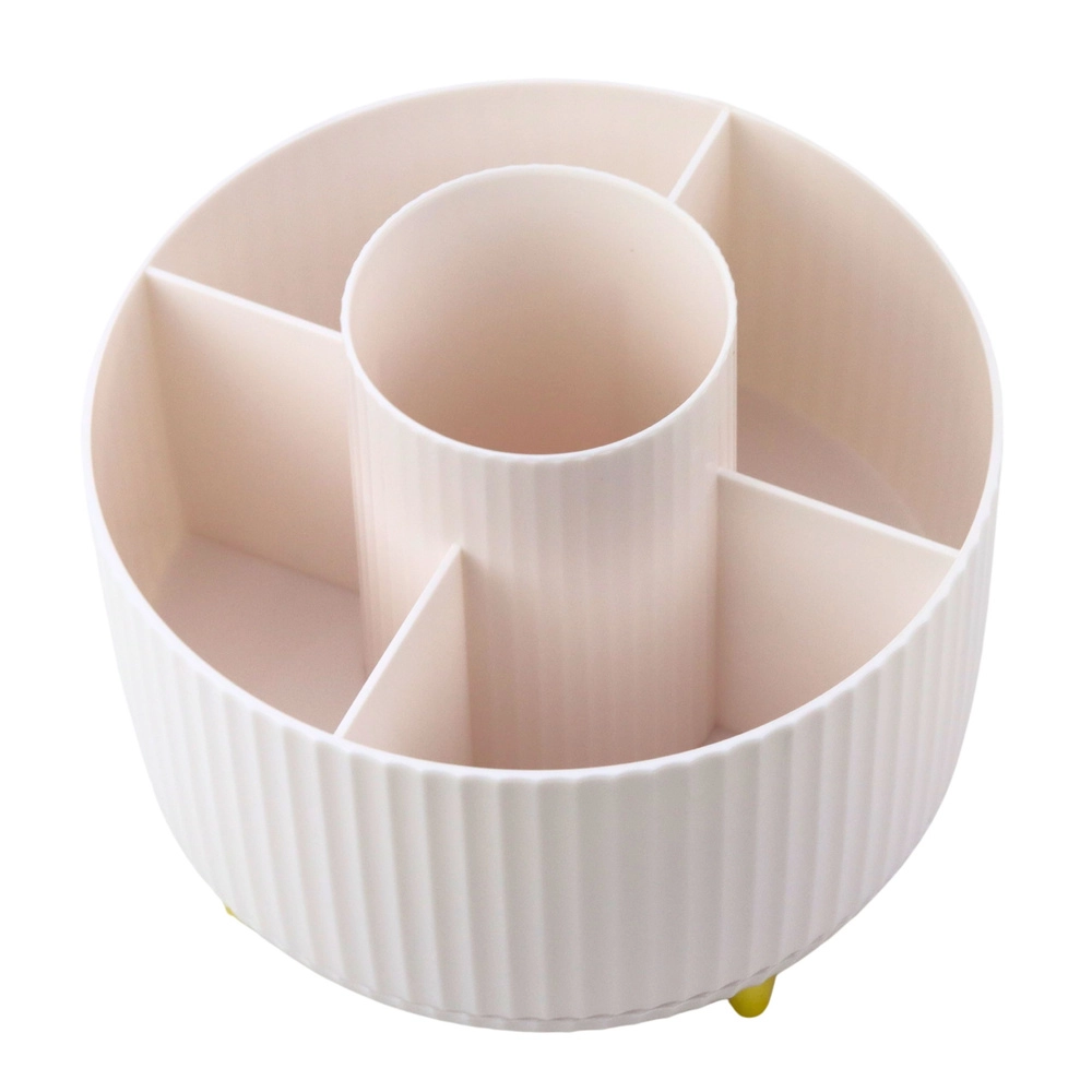Uredite svojo toaletno mizico pregledno in z eleganco. Vrtljivi organizer s premerom 14 cm omogoča hiter dostop do vseh kozmetičnih nujnosti – dovolj je rahel zasuk. Odprta konstrukcija ne omejuje višine shranjevanja, zato brez težav sprejme tudi dolge čopiče ali svinčnike za oči in ustnice.