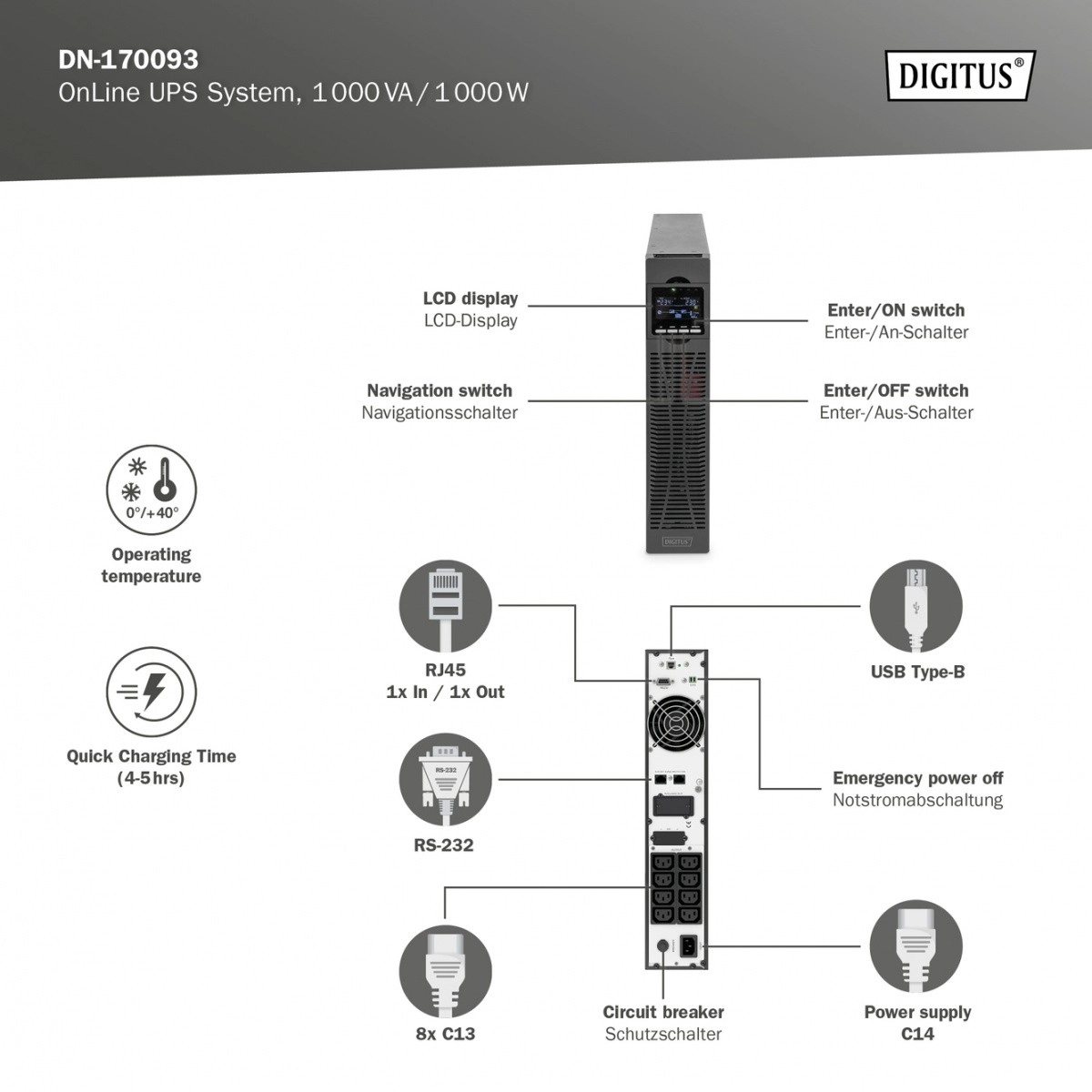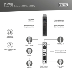 Zanesljiv UPS sistem DIGITUS s tehnologijo on-line dvojne pretvorbe ščiti občutljive naprave pred izpadi in nihanjem napetosti. Ponuja 1000 VA / 1000 W moči, širok vhodni razpon, inteligentno polnjenje in visoko preobremenljivost. Zahvaljujoč vrtljivemu LCD-ju enostavno nastavite vse parametre, na voljo je 8 vtičnic C13 ter vmesnika USB/RS232 za nadzor, z možnostjo SNMP za oddaljeno upravljanje.