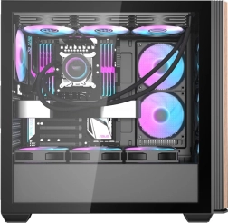 Stilsko in prostorno PC ohišje Darkflash DS900WS ponuja panoramsko zasnovo brez A‑stebrička, kombinacijo lesa, kovine in kaljenega stekla ter odličen pretok zraka. Podpira matične plošče ATX/M-ATX/ITX, dolge grafične kartice in visoke CPU hladilnike. Priloženi so 4 prednameščeni ARGB ventilatorji, možnost do 10× 120 mm ventilatorjev in 360 mm radiator. Praktični prašni filtri, 7 PCI rež in bogat I/O zagotavljajo enostavno sestavo in prihodnje nadgradnje.