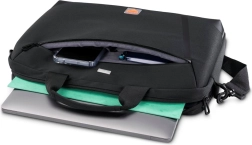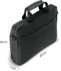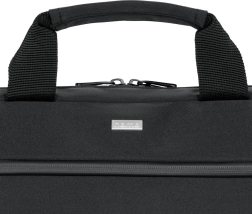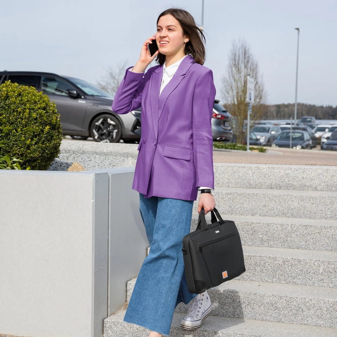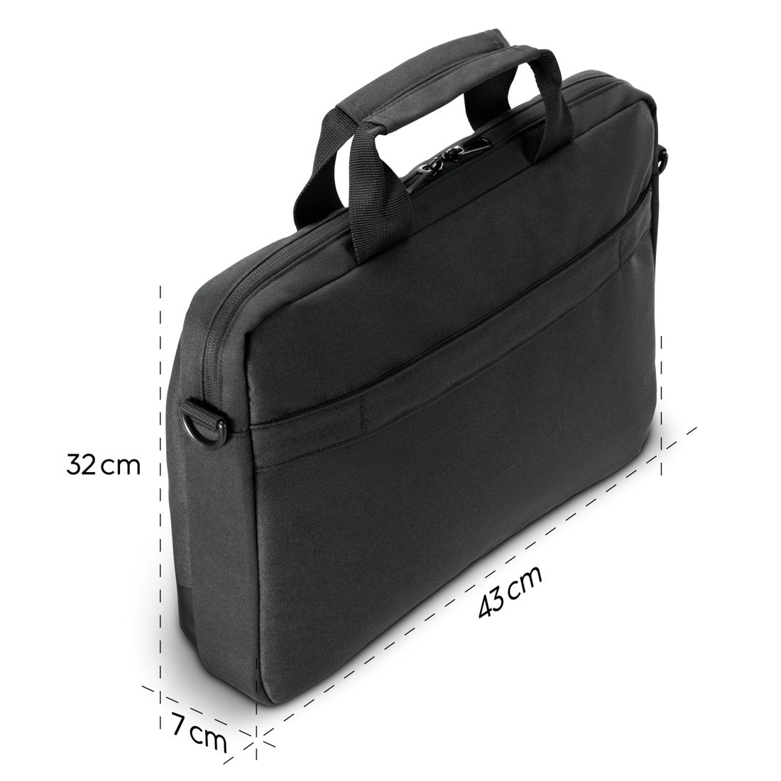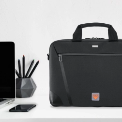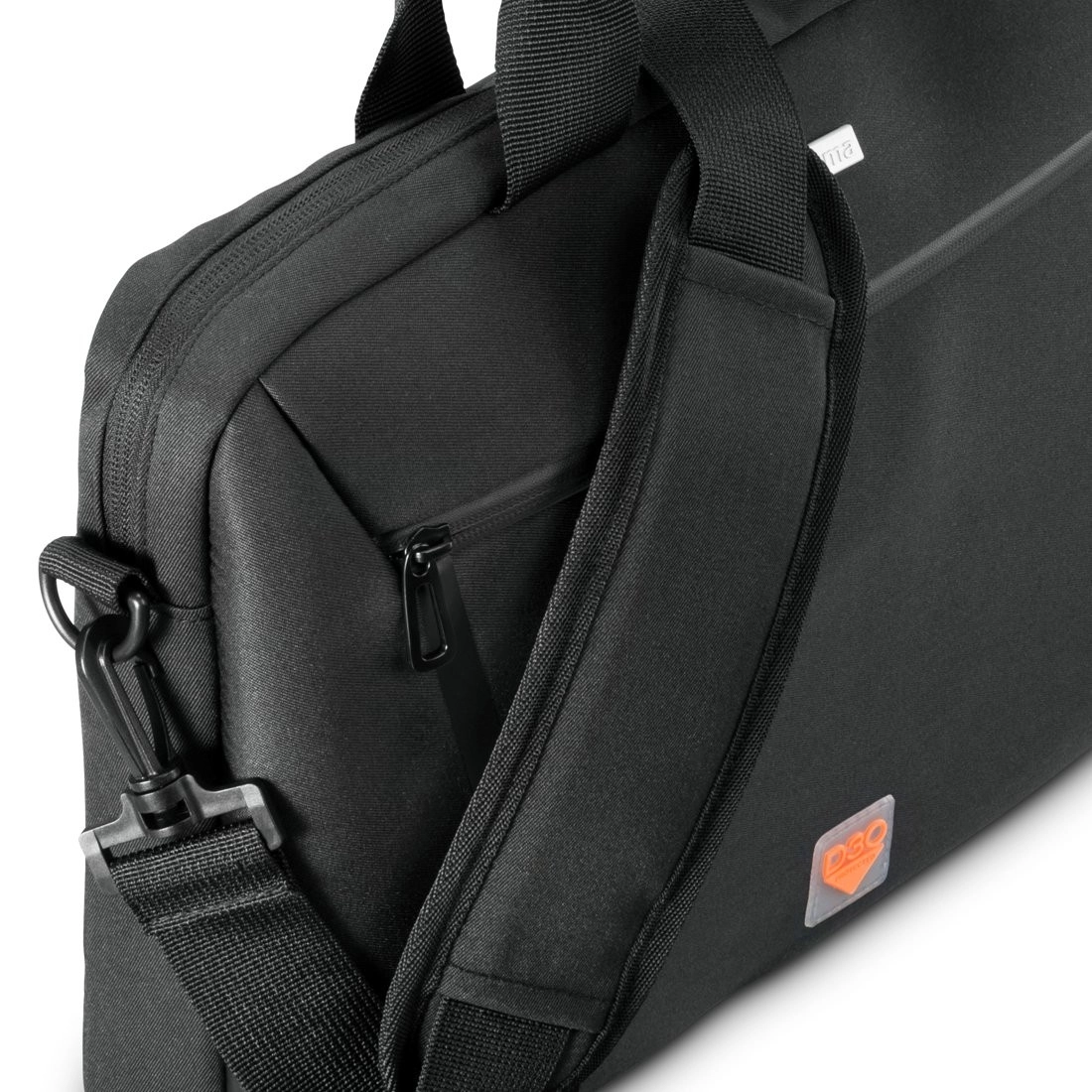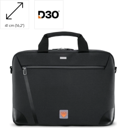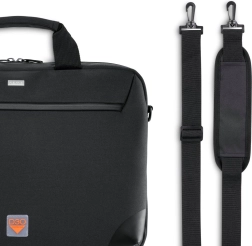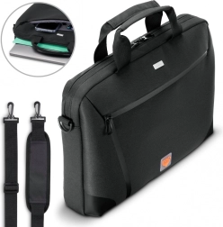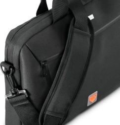 Praktičen sprednji žep z organizatorjem ohranja kable, polnilnik, telefon in dokumente pregledno na svojem mestu. V notranjosti je elastičen fiksirni trak z ježkom, ki prenosnik varno pritrdi. Za udobje pri nošenju sta na voljo odstranljiv in nastavljiv ramenski trak ter trak za namestitev na ročaj kovčka. Eleganten videz dopolnjujejo detajli iz recikliranega (eko) usnja.