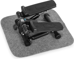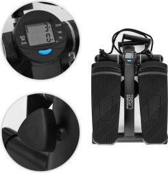 Vgrajeni LCD zaslon (5 funkcij) jasno prikazuje čas, koraki/min, skupno število korakov, porabljene kalorije in način SCAN. Nedrseča pedala in stabilizacijske nogice zagotavljajo varnost in udobje. Zaščitna podloga iz volnene klobučevine duši vibracije, ščiti tla in preprečuje premikanje naprave tudi v manjših prostorih.