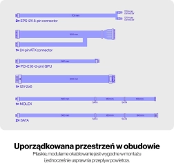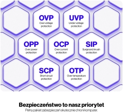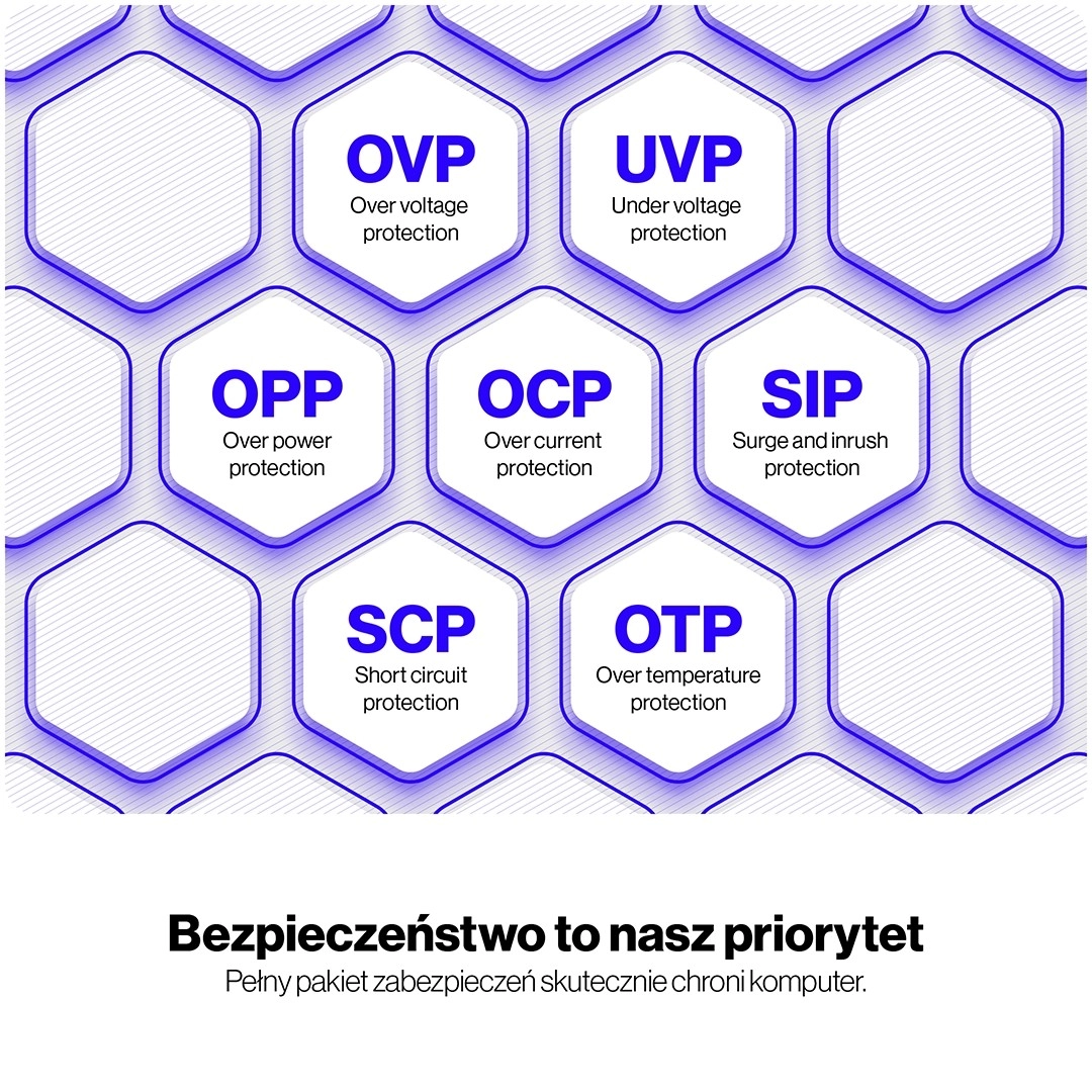 Uporabljeni japonski kondenzatorji (105 °C) zagotavljajo stabilnost v zahtevnih pogojih. Popolnoma modularno ožičenje poenostavi upravljanje kablov, izboljša pretok zraka in zniža temperature. Paket električnih in toplotnih zaščit ščiti vaš računalnik pred preobremenitvijo, prenapetostjo, kratkim stikom in pregrevanjem. Kakovost potrjuje 10-letna garancija.
