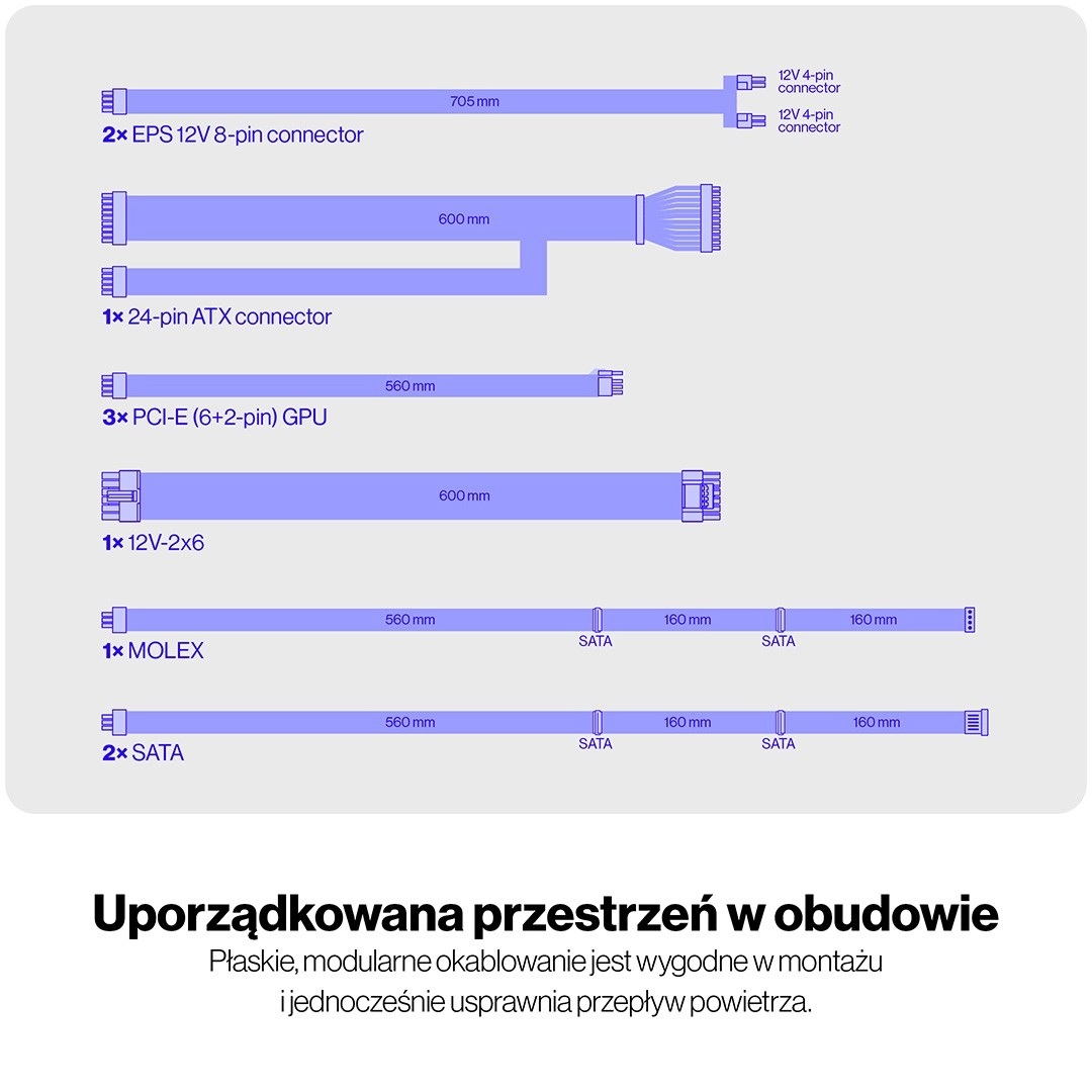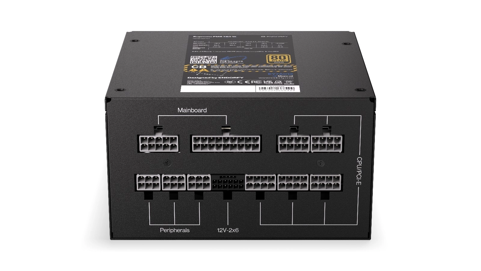 Supremo FM6 750 W izpolnjuje novejši standard ATX 3.1 in zlahka obvlada kratkotrajne konice porabe. V paketu je priložen kabel 12V-2x6 za polno združljivost s sodobnimi grafičnimi karticami PCIe 5.1, na voljo so tudi klasični PCI-E 6+2 PIN priključki za tradicionalne GPU.