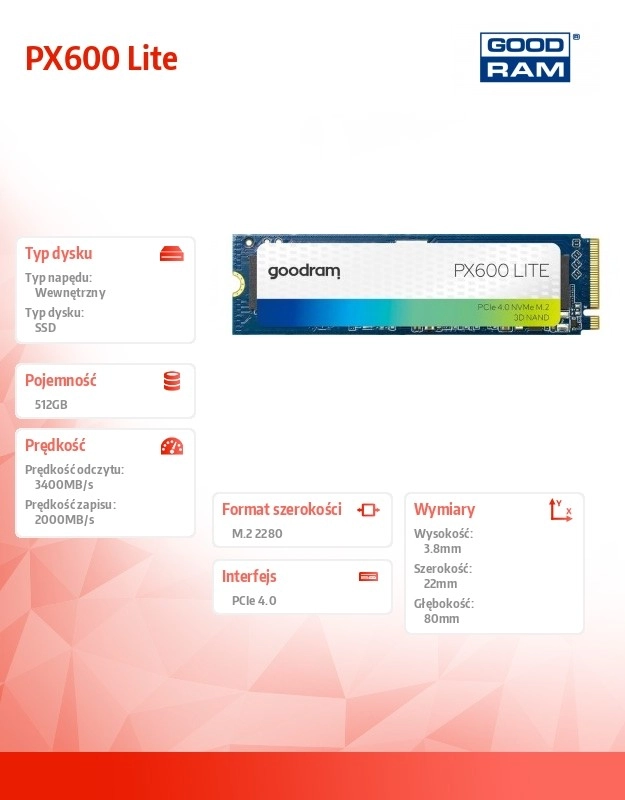 PX600 Lite je idealna izbira za nadgradnjo prenosnika ali PC-ja, kjer boste cenili visoko prenosno hitrost, nizko porabo energije in stabilno delovanje. Zahvaljujoč vmesniku PCIe Gen4 x4 (NVMe) pospeši zagon sistema, nalaganje aplikacij in delo z velikimi datotekami.