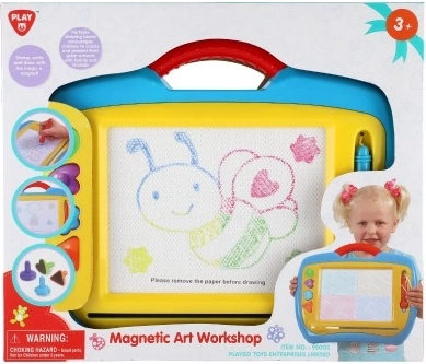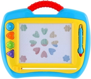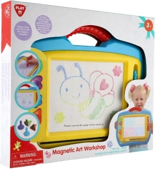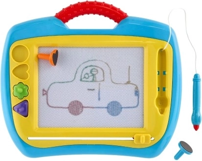 Magnetna tablica je odlična alternativa papirju – otroci lahko rišejo znova in znova, brez flomastrov in brez madežev. Zahvaljujoč praktični pomični gumi/drsniku se risba preprosto izbriše in prostor je pripravljen za novo delo. Trpežna plastična izvedba z ročajem olajša prenašanje.