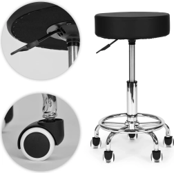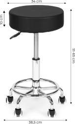 Odporna izdelava in enostavno vzdrževanje – oblazinjenje iz PVC usnja je nezahtevno za čiščenje ter odporno na vodo, masažna olja in razkužila. Kovinska (kromirana) konstrukcija s široko petkrako osnovo s kolesci zagotavlja stabilnost in gladko premikanje po večini tal brez prask.