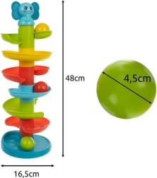 Ta izobraževalna in senzorična igrača je idealna za otroke od 18 mesecev. Spodbuja razvoj fine motorike, koordinacije oko–roka in učenje vzrok–posledica. Zahvaljujoč preprosti montaži in kompaktni zasnovi jo lahko hitro sestavite, razstavite in vzamete s seboj na pot. Stolp z motivom slona ter šest barvitih žogic je odličen predlog za darilo.