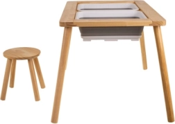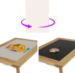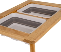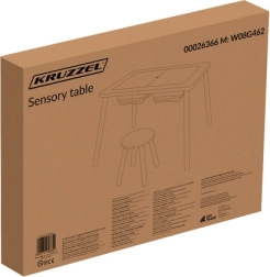 Senzorična miza KRUZZEL združuje varnost, kakovost in funkcionalnost. Izdelana je iz certificiranega bukovega lesa z gladko obdelavo ter zaobljenimi robovi za mirno igro brez skrbi. Obojestranska delovna površina in dva odstranljiva plastična zaboja v hipu spremenita mizo v peskovnik, vodno mizo ali površino za risanje in ustvarjanje.
