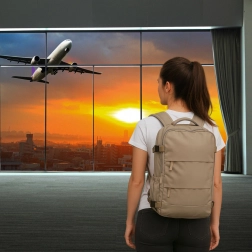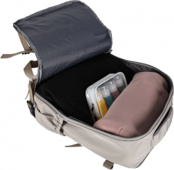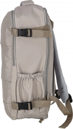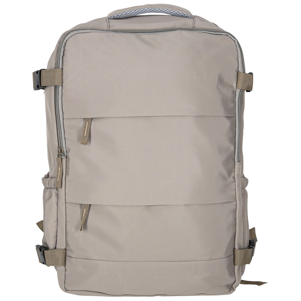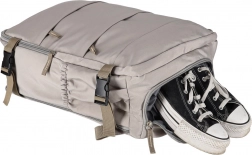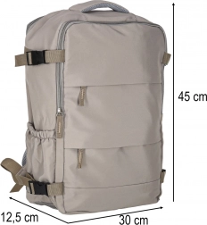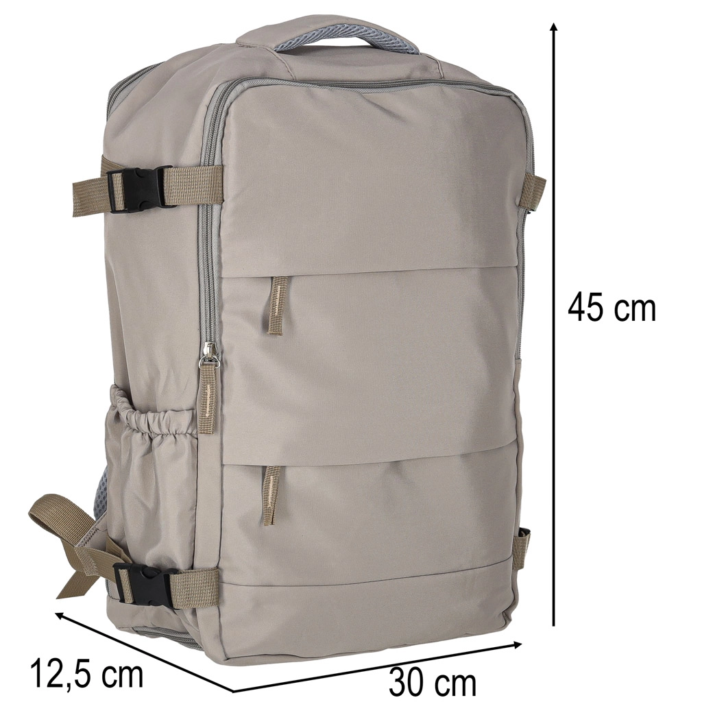 Štirje kompresijski trakovi zmanjšajo volumen in učvrstijo vsebino, zato nahrbtnik drži obliko tudi pri delni napolnjenosti. Dva sprednja žepa na zadrgo in dva elastična stranska žepa sta idealna za steklenico ali dežnik. Kompaktne mere 45 × 30 cm ustrezajo zahtevam številnih letalskih družb za ročno prtljago.