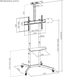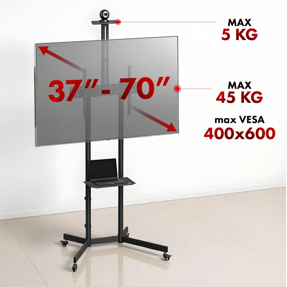 Sestavni del je višinsko nastavljiva sredinska polica za predvajalnike, konzole ali set-top boxe (nosilnost 5 kg) ter zgornja polička za kamero – odlično za videokonference in predstavitve. Kolesa z zavoro omogočajo tekoč premik med prostori in zanesljivo fiksiranje na mestu.