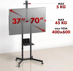 Mobilno stojalo za TV je idealno za sejne sobe, učilnice in domačo rabo. Stabilna jeklena konstrukcija zagotavlja varno pritrditev večine sodobnih televizorjev do teže 45 kg. Zaradi široke združljivosti VESA (100×100 do 600×400) enostavno namestite zaslone številnih blagovnih znamk, kot so Sony, LG, Samsung ali Philips.