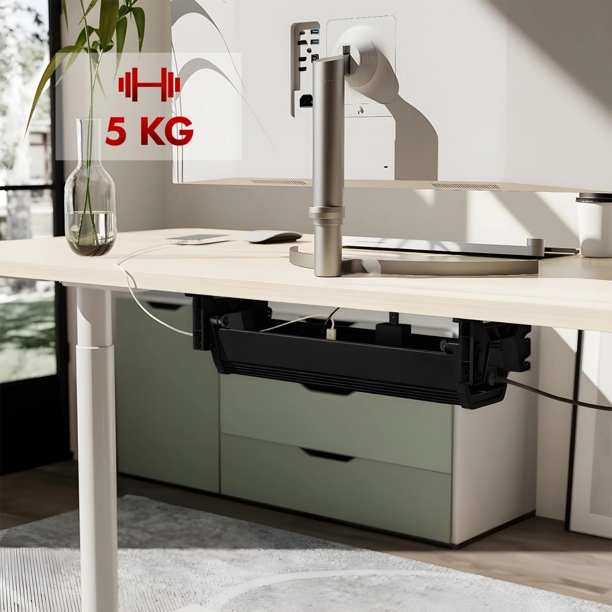 Montaža je prilagodljiva – izberete lahko dve različni višini pritrditve glede na tip mize in količino kablovja. Hiter dostop omogoča enostavno odpiranje, zato dodajanje ali zamenjava kabla ne zahteva demontaže celotnega elementa. Idealno za pisarne, domače delovne sobe in coworking prostore, kjer sta red, ergonomija in varnost na prvem mestu.
