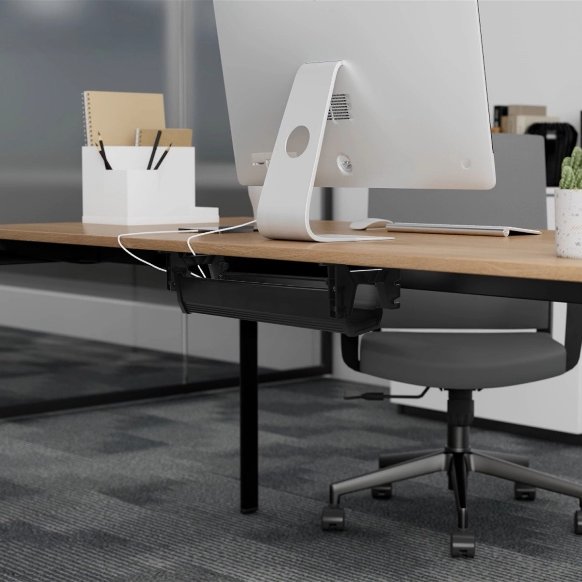 Kanal pod mizno ploščo drži napajalno letev in kable izven vidnega polja, kar izboljša estetiko in varnost vašega delovnega mesta.