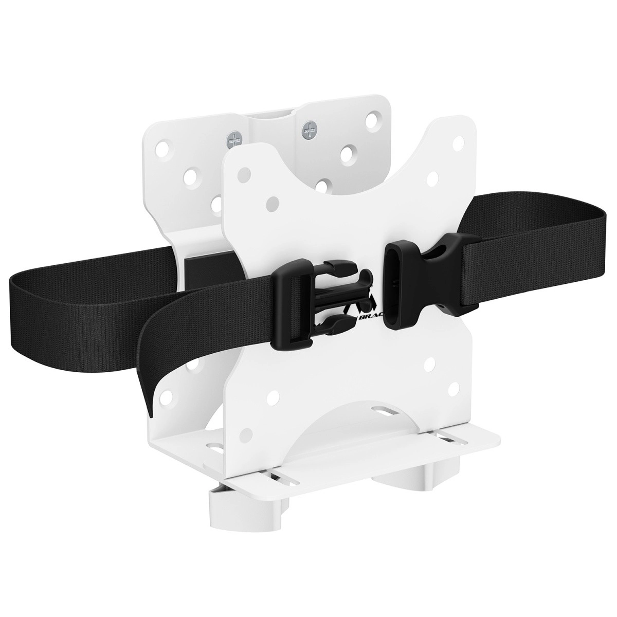 Širok nastavljiv trak z zaponko trdno fiksira mini računalnik v nosilcu. Poveča varnost pri vibracijah in pogostem premikanju ter ščiti napravo pred nenamernim izpadom.