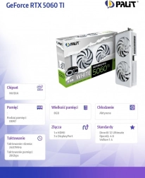 Palit GeForce RTX 5060 Ti White OC je zasnovana za igralce in ustvarjalce, ki želijo združiti čist bel videz z učinkovitim hlajenjem in stabilno zmogljivostjo. Dva 95-milimetrska aksialna ventilatorja zagotavljata tih tek in zanesljivo odvajanje toplote, medtem ko 2-režna zasnova olajša vgradnjo v bolj kompaktna ohišja.