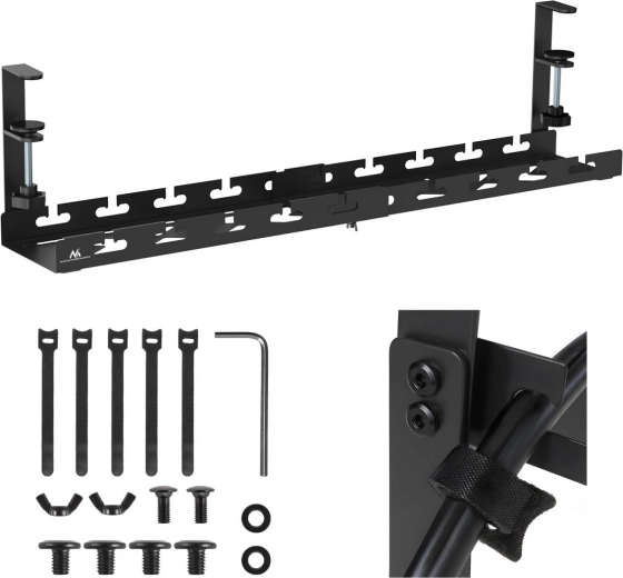 Ohranite red pod mizo s praktičnim podmiznim organizatorjem kablov s pritrditvenimi sponami. Zahvaljujoč nastavljivemu razponu dolžine 433–728 mm boste nosilec zlahka prilagodili različnim ploščam in razdelilnim letvam. Brez vrtanja in trajnih posegov v pohištvo ga hitro namestite ali odstranite, kable speljete skozi prehodne odprtine in tako izboljšate red, varnost in estetiko delovnega mesta.
