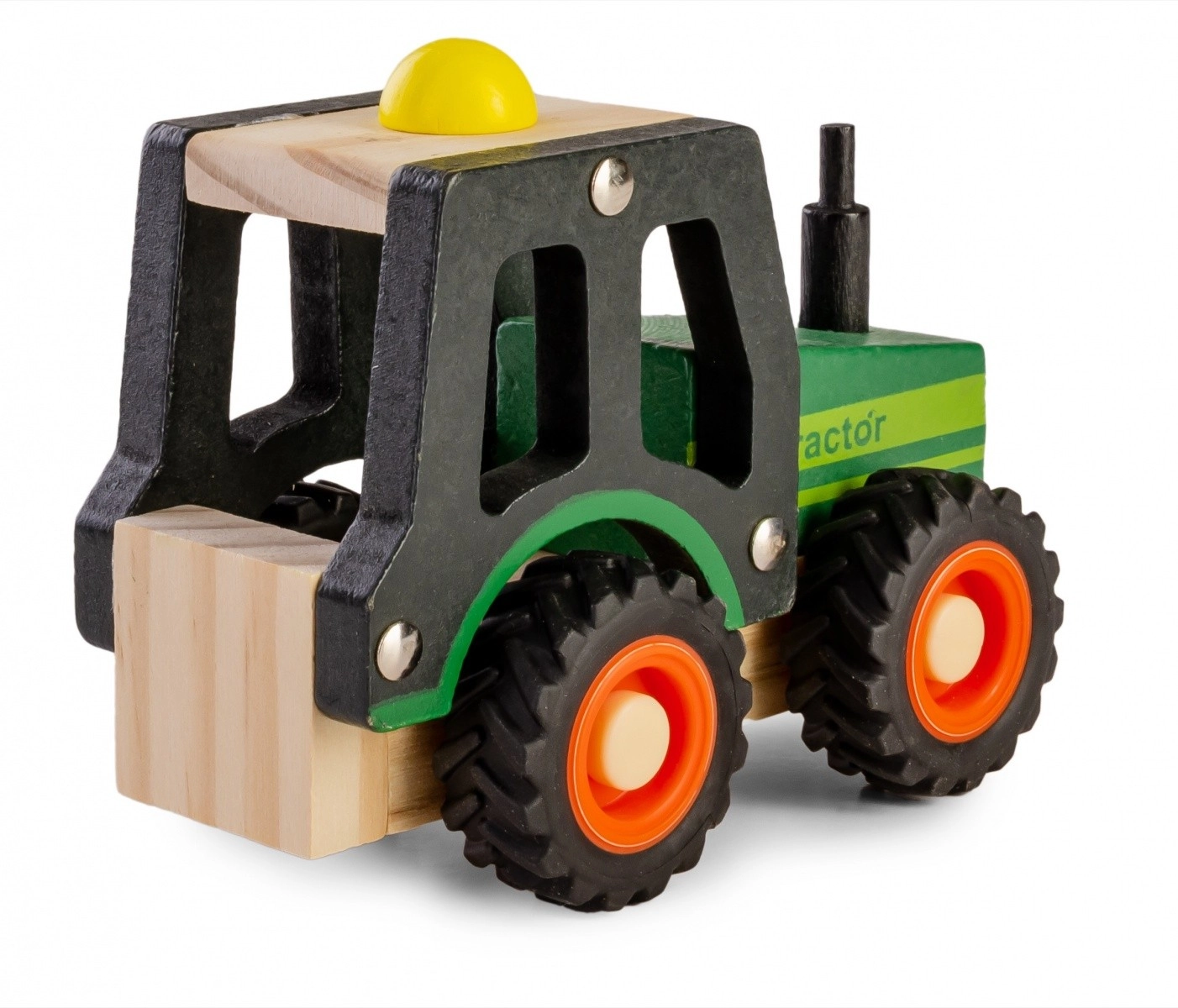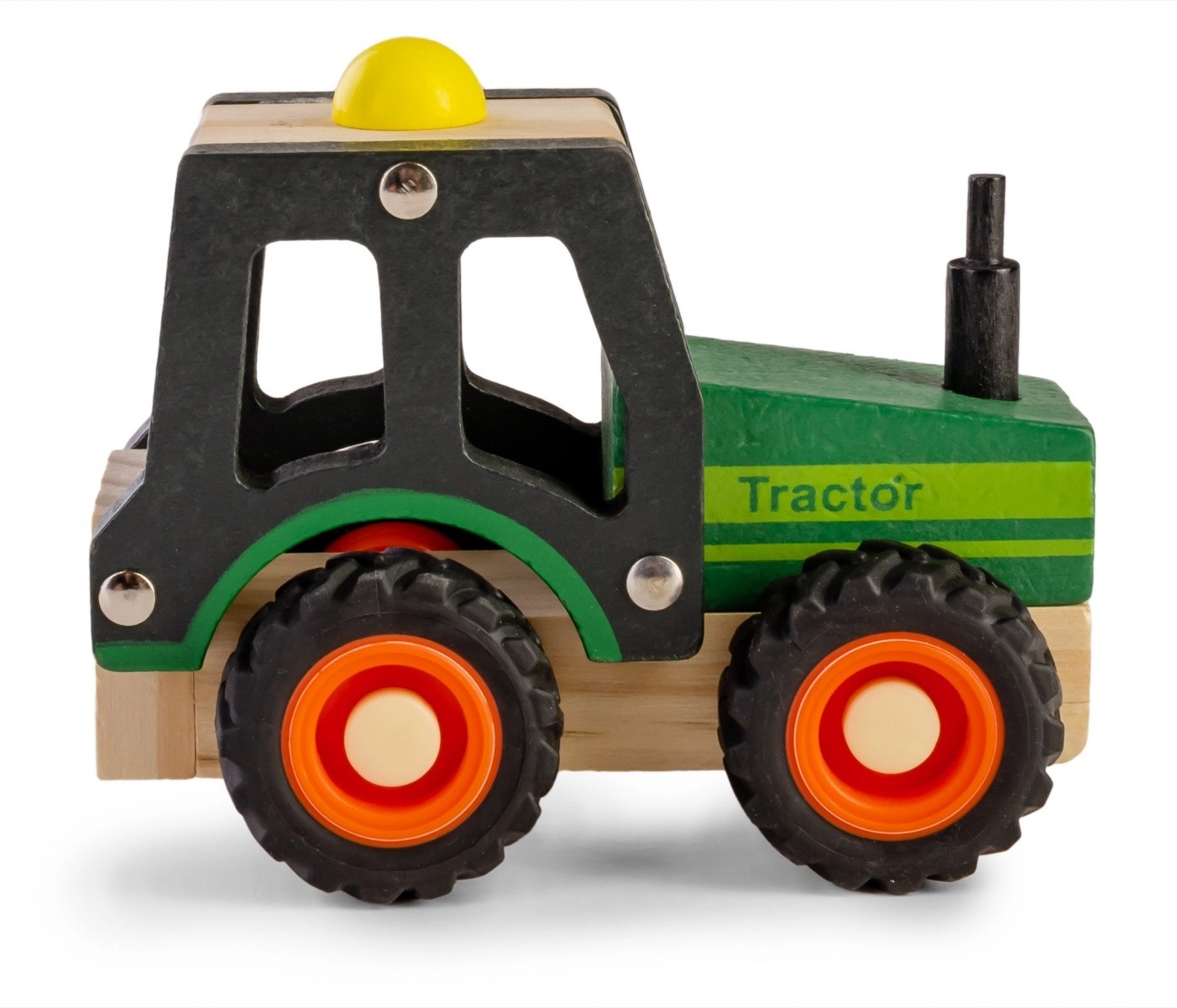 Leseni traktor je odlična izbira za prva vozila v otroški sobi. Zaradi robustne izdelave in zaobljenih oblik je varen, prijeten na dotik in pripravljen na vsakodnevno igro. Mehke gumijaste pnevmatike zagotavljajo dober oprijem in tih premik po tleh.