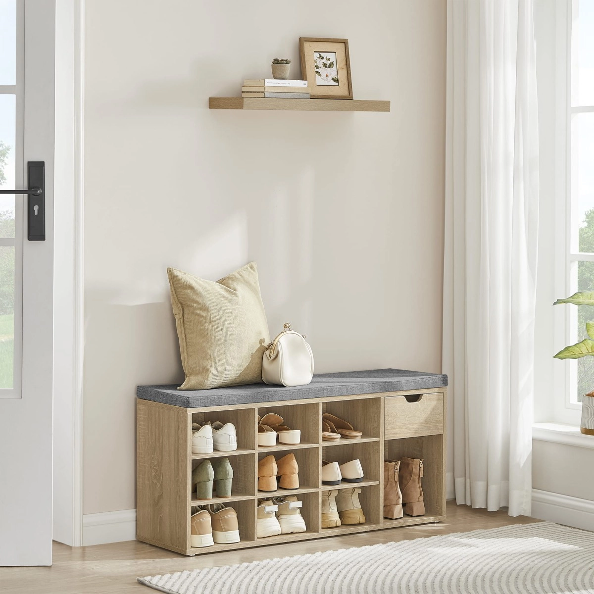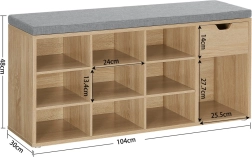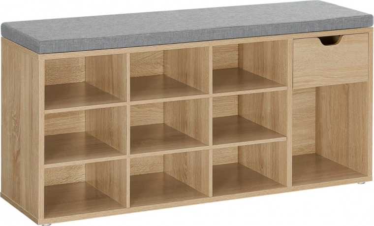Na zgornji plošči je mehak siv sedež debeline približno 4,5 cm, ki je na ohišje pritrjen z ježkom – zato ga zlahka snamete in očistite. V notranjosti je 10 globokih polic za obutev do približno velikosti 44 ter praktičen prostor za drobnarije. Vsaka polica prenese do 10 kg, skupna nosilnost omarice je 200 kg.