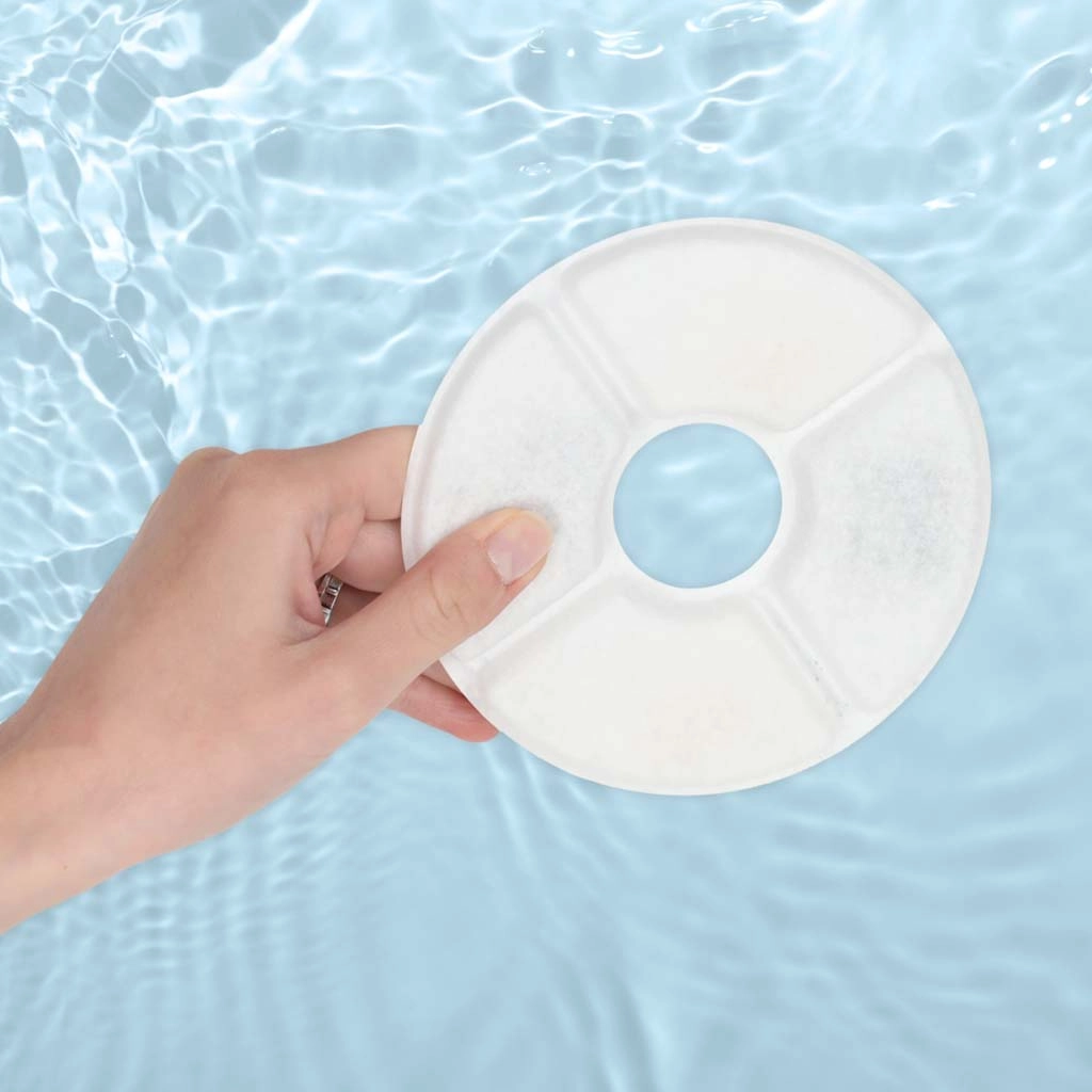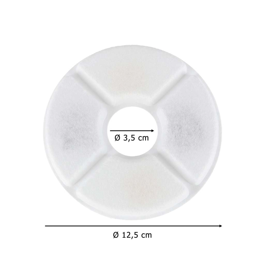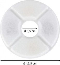 Filtri imajo premer 12,5 cm in sredinsko odprtino 3,5 cm, zato se zlahka prilegajo večini okroglih fontan s centralnim stebrom. Namestitev je hitra in brez orodja – le vstavite, splaknite in uporabljajte.