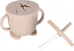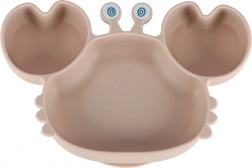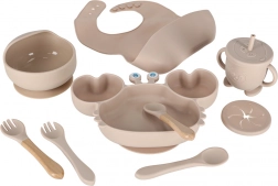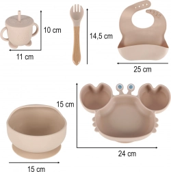 Ta praktičen komplet iz mehkega silikona vključuje vse, kar potrebujete za vsakodnevno hranjenje malčkov: krožnik v obliki raka s tremi razdelki, skodelico s priseskom, lonček z dvema pokrovoma (vključno s pokrovom s slamico), štiri kose jedilnega pribora in nastavljiv slinček z žepkom. Priseski na krožniku in skodelici preprečujejo prevrnitev in drsenje posode, medtem ko razdelki pomagajo ločiti posamezne porcije.