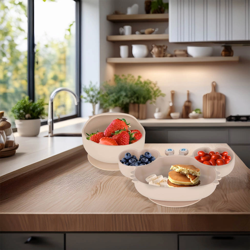Silikonski priseski držijo posodo trdno na mizi in pri vsakem obroku olajšajo pospravljanje.