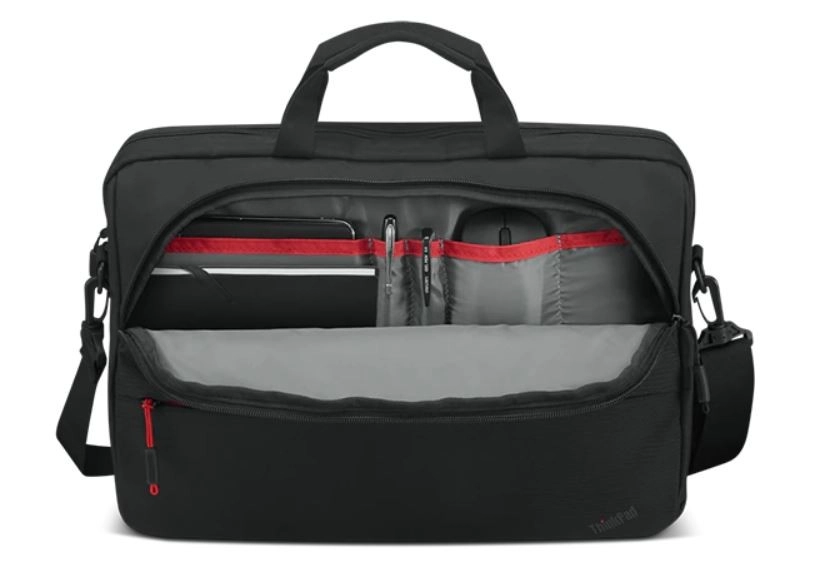 Praktična in tanka torba ThinkPad Essential Slim Topload Eco združuje zaščito naprave, pregledno organizacijo in udobje pri nošenju. Podloženi glavni predal varno sprejme prenosnik z diagonalo 13–14″, dodatni žepi pa poskrbijo, da je vsa dodatna oprema na svojem mestu.