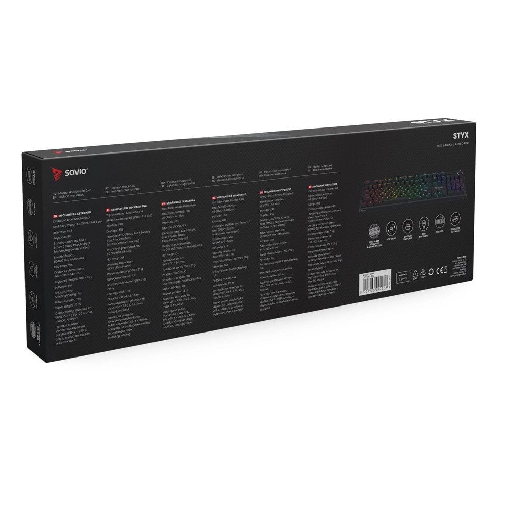 Savio STYX je polnoveljavna mehanska tipkovnica zasnovana za igralce in zahtevne profesionalce. Tiha linearna stikala OUTEMU PEACH SILENT z vgrajenimi dušilci zagotavljajo gladek pritisk, minimalen hrup in udobje tudi pri dolgem tipkanju ali nočnem igranju. Zahvaljujoč hot‑swap podnožjem zlahka zamenjate stikala brez spajkanja in prilagodite odziv točno svojim preferencam.