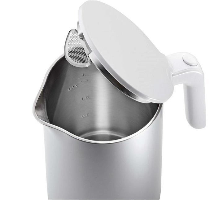 Brezšivna nerjaveča posoda z notranjimi merilnimi oznakami do 1,5 l in finim nerjavečim filtrom v izlivu zagotavlja čisto nalivanje in boljši okus vode.