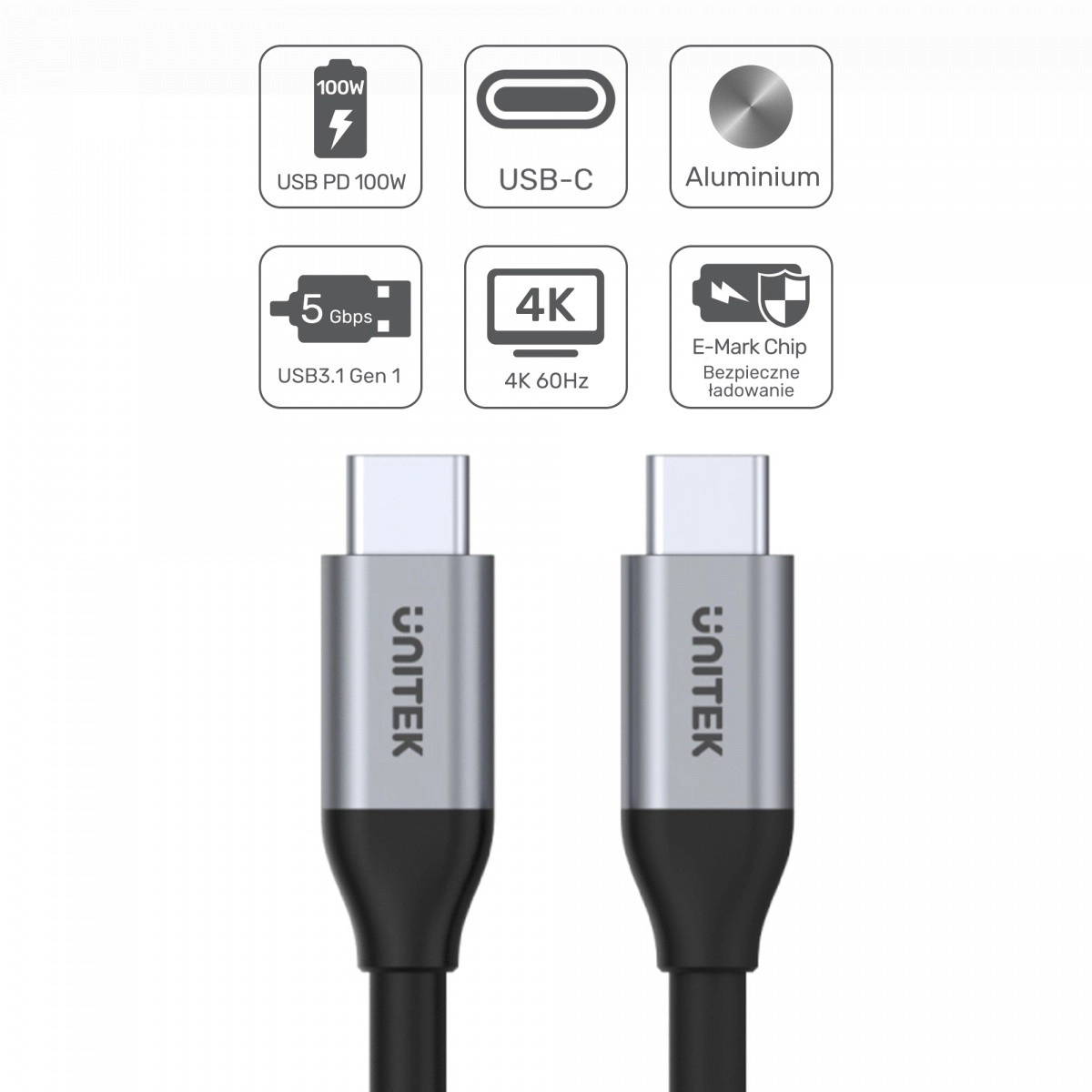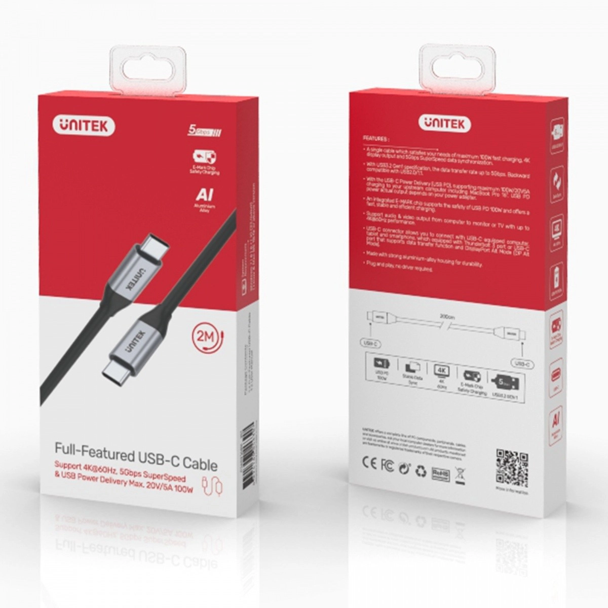Univerzalen kabel USB‑C ↔ USB‑C dolžine 2 m za hiter prenos podatkov, slike in napajanja. Ponuja do 100 W Power Delivery, prenos podatkov 5 Gbps (USB 3.1 Gen 1) in video do 4K pri 60 Hz. Zahvaljujoč E‑MARK čipu in aluminijastim konektorjem je povezava hitra, stabilna in varna.