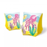 Rokavčka imata igrive ilustracije meduz, hobotnic in rakov v živahnih barvah na rumenem ozadju, kar otroke spodbuja k plavanju.