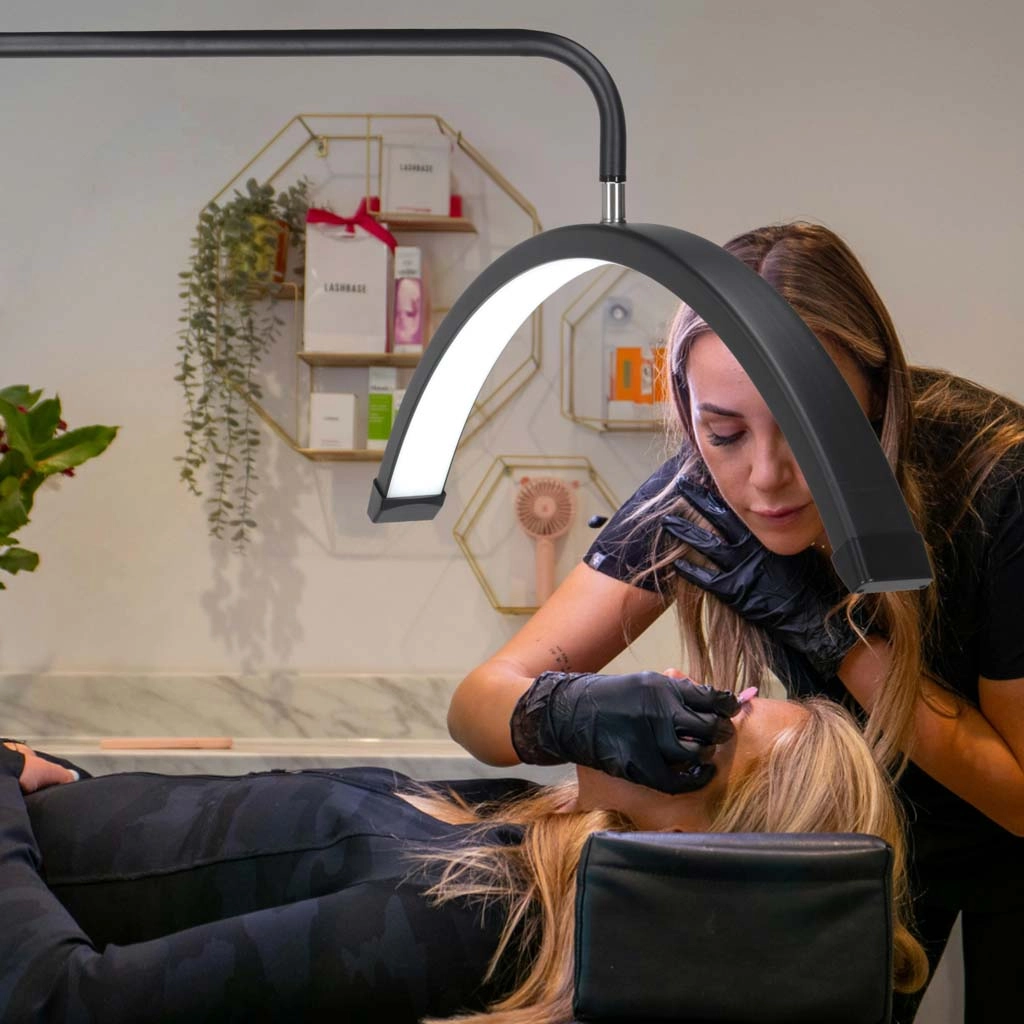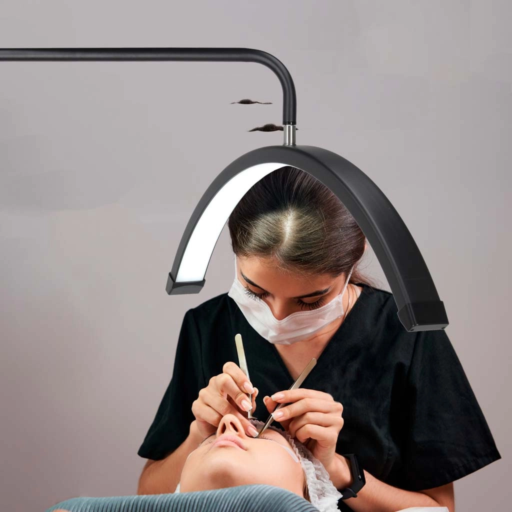 Ločna LED glava (64 cm) enakomerno osvetli delovno površino brez ostrih senc – idealno za natančno delo pri trepalnicah, obrveh in nohtih.